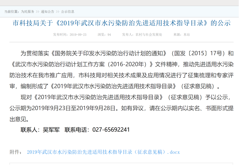 9月23日,武汉市科技局将《2019年武汉市水污染防治先进技术指导目录》进行了网上公示。我公司自主研发的“市政污泥堆场快速原位固化材料及设备新技术”成功入选。