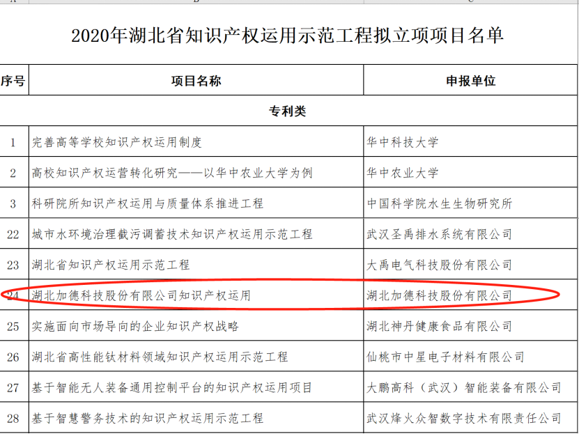2017年公司成功被评为“国家知识产权优势企业”,2018年入选“湖北省知识产权示范建设企业”,本次申报立项,不仅是对公司知识产权管理工作的肯定,同时也是新的挑战,下阶段公司将进一步建立健全和完善知识产权制度,加强知识产权量质提升,运用知识产权参与市场竞争,进一步加强知识产权保护、管理能力,利用知识产权提升综合竞争力,大力有助于公司的技术创新开展局面,提高企业创造和运用知识产权的水平,不断增强企业市场核心竞争力,实现知识产权强企的开展目标。