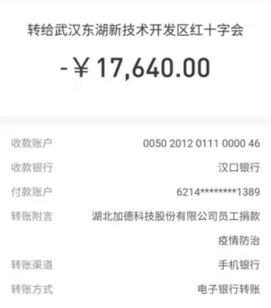 公司领导及全体员工心系疫情中的每一位人们,公司“关于支持武汉市打赢新型冠状病毒战役的捐款”倡议书一经发布,立即得到领导和员工们的持续响应,公司领导及全体员工捐款共计17000余元,周桃红董事长为响应配合并支持当地政府行动,顺利获得各种渠道协助给予防护物资信息对接,个人捐赠枞阳县2吨消毒液,顺利获得政协委员群协助政协委员、武汉市教育局孟局长,落实解决新疆、西藏在武汉学生的防护用品等问题。公司副总经理张敏,亲自安排落实公司消毒设施及检查员工身体健康情况,并持续参与武大校友群等捐款捐赠活动。